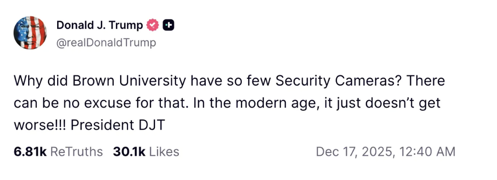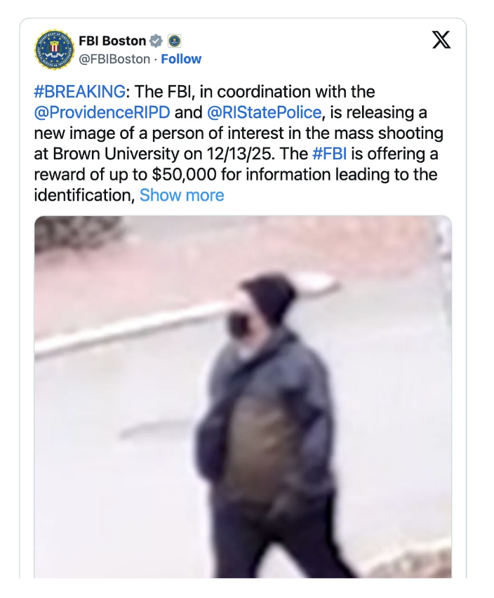 The Brown shooting triggered a massive response, with about 400 officers going door to door on campus and through nearby neighborhoods in search of information. The lack of surveillance video — at a school with a $7 billion endowment and more than 1,200 cameras installed in campus buildings — has sparked fierce criticism, as the grainy images of the person of interest appear to come from home security cameras, not the university’s own system.