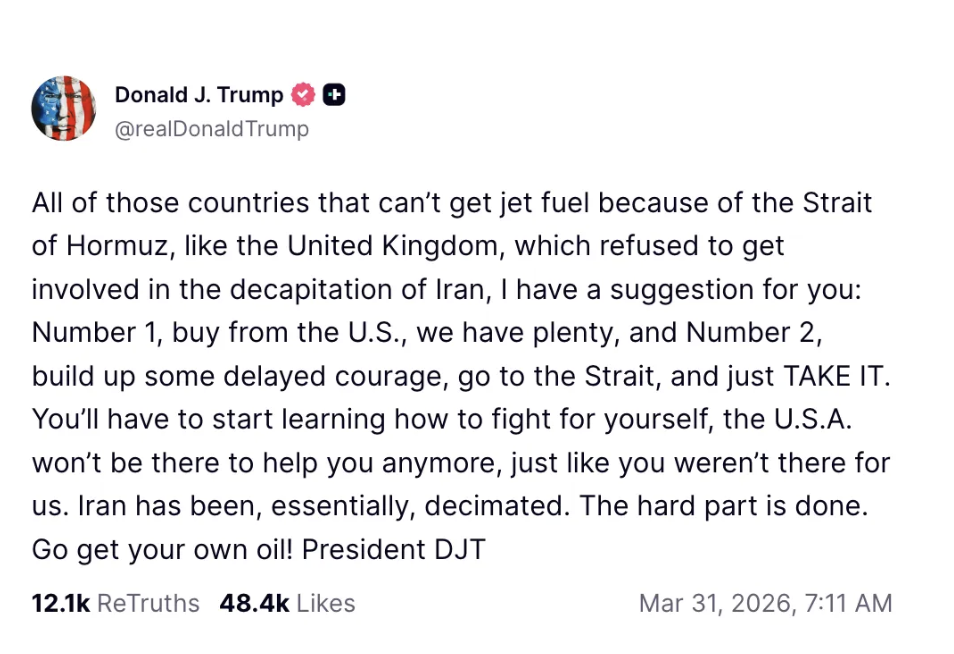 “Build up some delayed courage, go to the Strait, and just TAKE IT. You’ll have to start learning how to fight for yourself, the U.S.A. won’t be there to help you anymore, just like you weren’t there for us,” Trump posted on Truth Social.