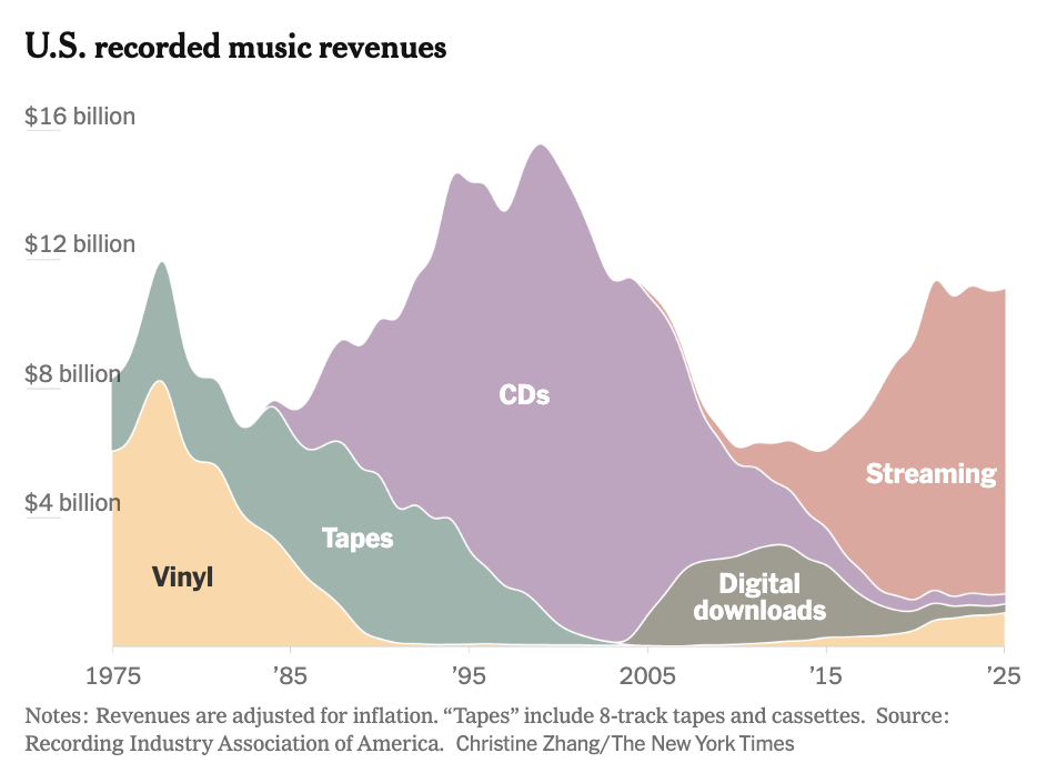 Vinyl still only accounts for a small slice of how people are listening to music. Streaming remains the dominant driver of revenue in the music industry, accounting for about $9.5 billion of the $11.5 billion in overall recorded revenue in 2025.