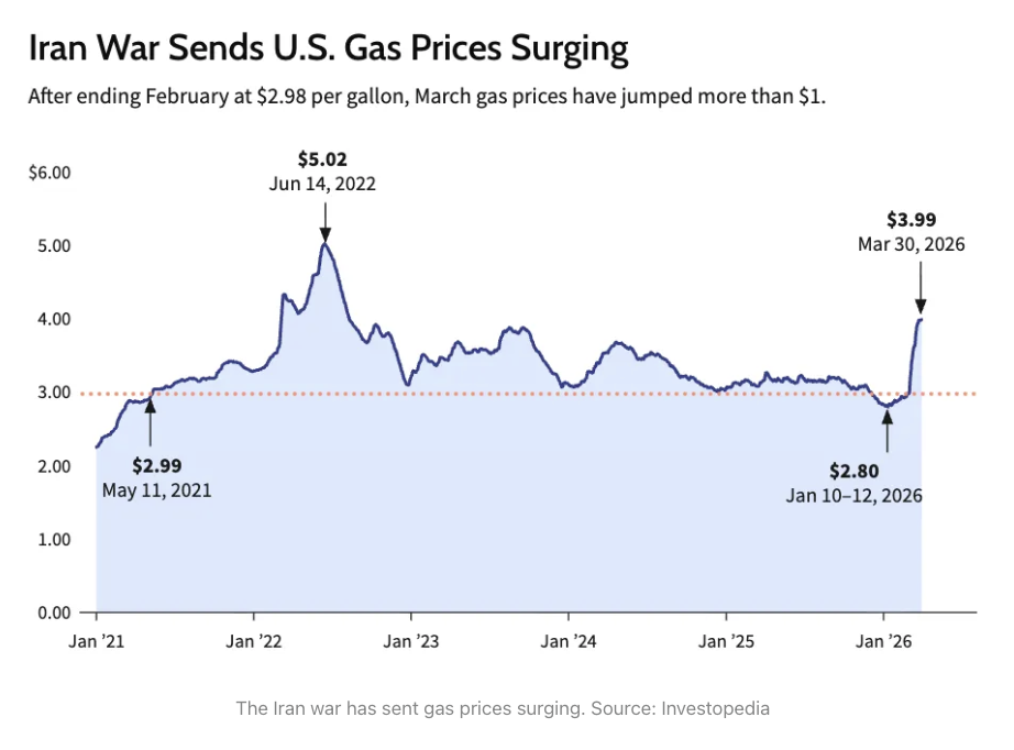 Average gas prices in the U.S. rose Tuesday to over $4 a gallon for the first time since 2022. It comes just over a month into Iran war, and is the largest monthly jump AAA has ever seen.
