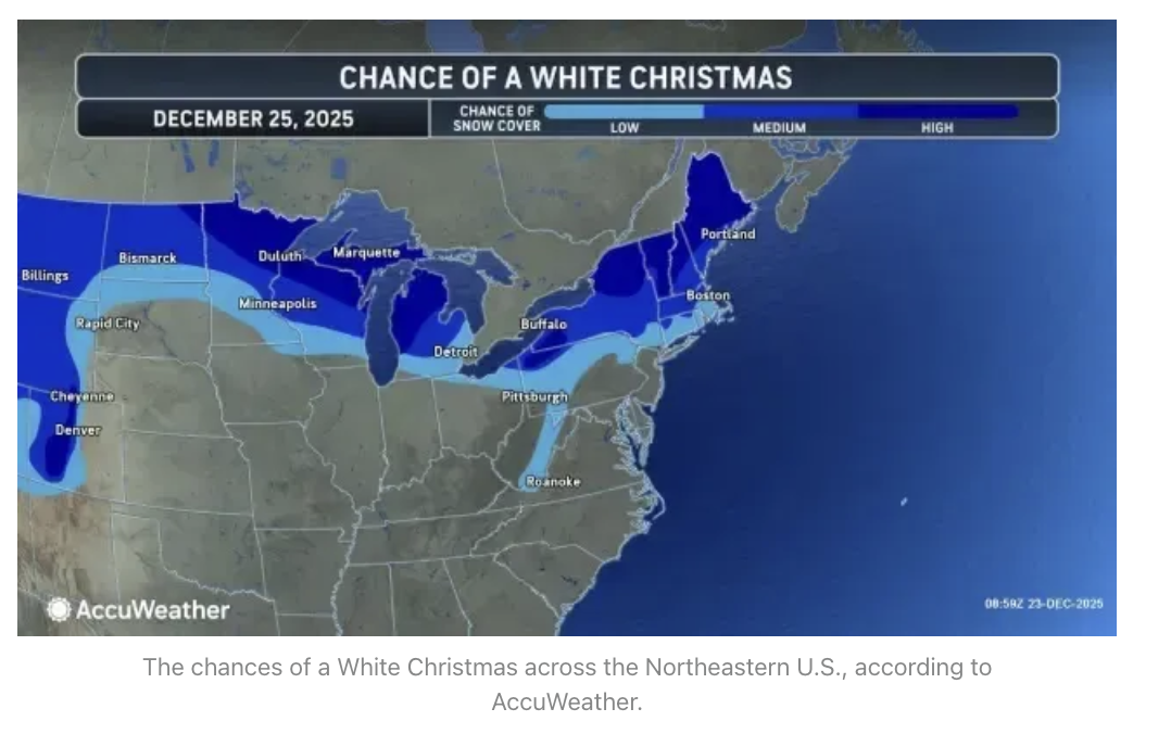 🎄There are a few spots in the US where there could be a white Christmas— and it’s the usual suspects in the northern part of the country: Upstate NY, Maine, New Hampshire, northern Minnesota and North Dakota.
