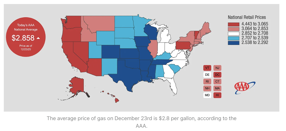AAA says the national average is below $3 per gallon— $2.86— right now.