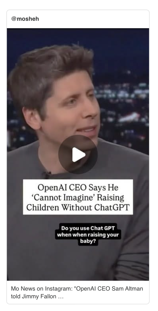 In case you missed it… OpenAI CEO Sam Altman told Jimmy Fallon on The Tonight Show that ChatGPT has been integral for him as a new parent.
