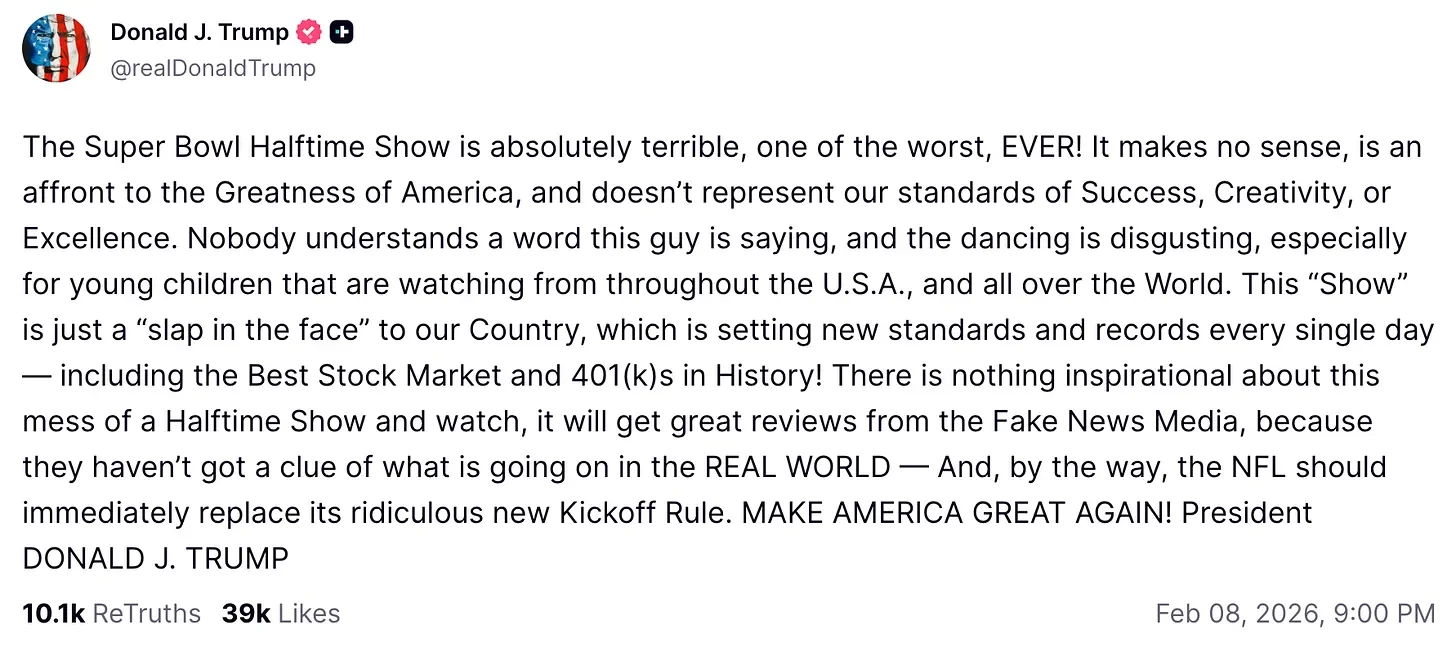 The Seattle Seahawks beat the New England Patriots 29–13 on Sunday, delivering a defensive masterclass on the field. But the action on the field was overshadowed by political backlash to Bad Bunny’s Super Bowl halftime performance.