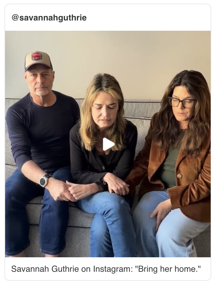 ‘Today Show’ host, Savannah Guthrie, published her latest social media video Monday afternoon, calling this moment “an hour of desperation,” and pleading with the public to help in the search. “We believe that somehow, some way, she is feeling these prayers and that God is lifting her even in this moment and in this darkest place,” she said of her mother. “We believe our mom is still out there.”