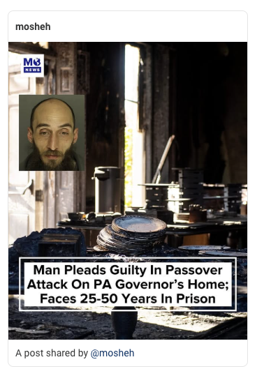 Pennsylvania Gov. Josh Shapiro (D) delivered emotional remarks Tuesday after the man who firebombed the governor’s mansion during Passover pleaded guilty to attempted murder and terrorism, and was sentenced to between 25-50 years in prison.