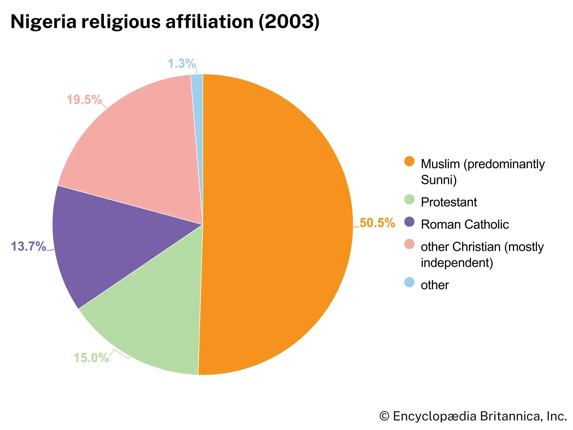 Nigeria remains sharply divided by religion, with about half the population Muslim and half Christian, including Protestants and Roman Catholics, as of the early 21st century. That split has made the country particularly vulnerable to sectarian conflict, especially in the northeast, where Boko Haram is most active.
