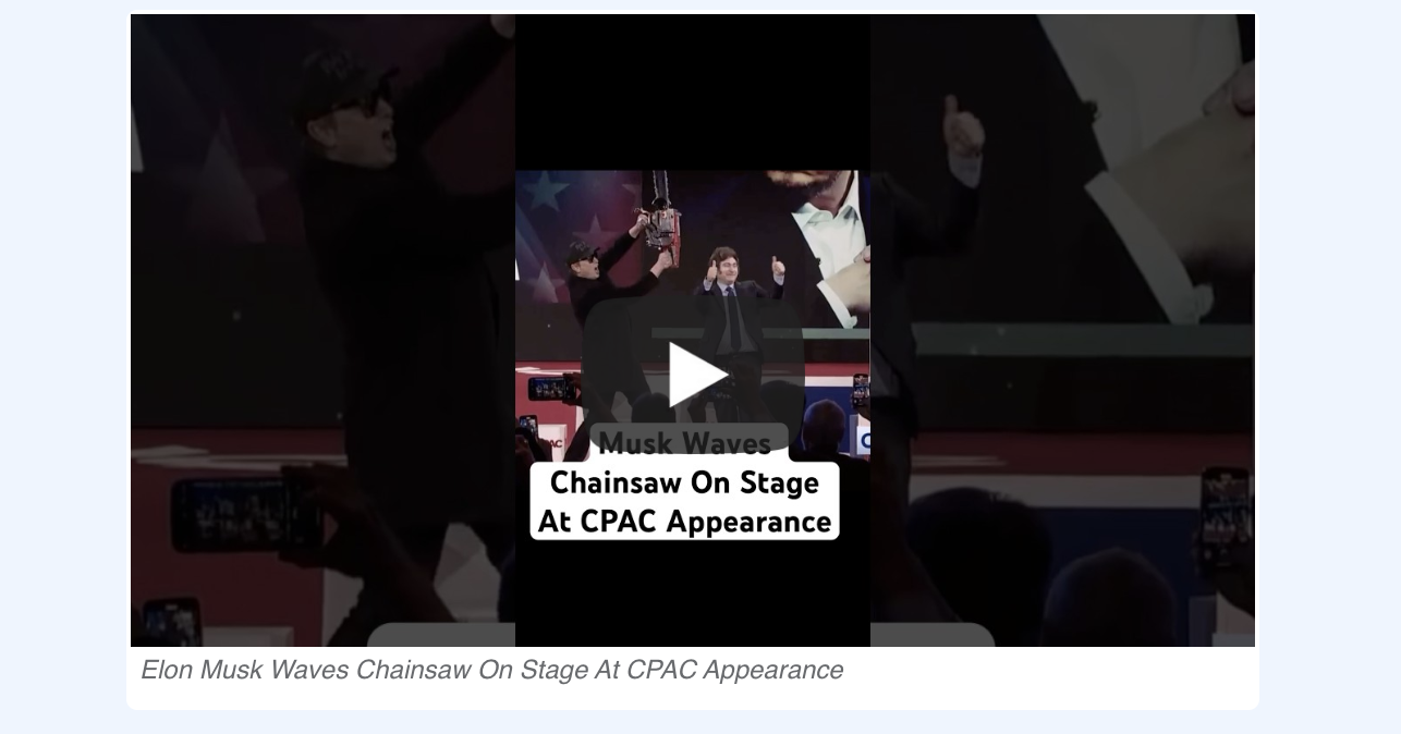 In case you missed it… Elon Musk, at the Conservative Political Action Conference Thursday, was gifted a chainsaw by Argentine President Javier Milei with “Viva la libertad, carajo” (translation: “Long live liberty, damn it”) engraved in it.