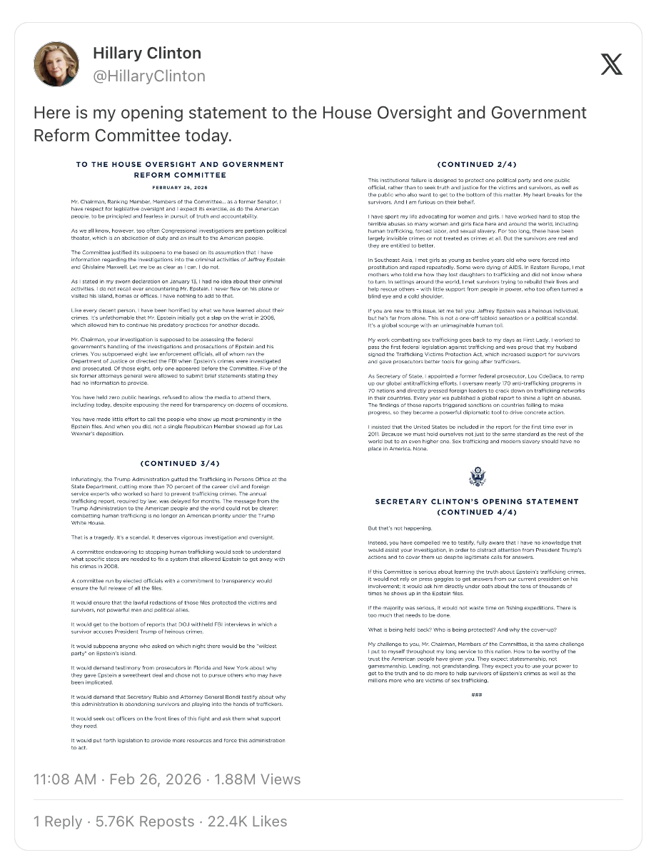 Hillary Clinton released the transcript of her opening statement to the committee on X Thursday morning, which called on lawmakers to ask Trump “under oath about the tens of thousands of times he shows up in the Epstein files.” She accused the administration of a cover-up and called Congress’s investigation a “fishing expedition.”