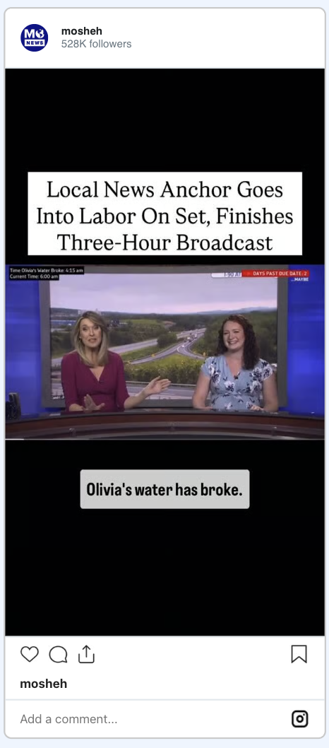 In case you missed it… Local news anchor Olivia Jaquith’s water broke just minutes before Wednesday morning’s broadcast began on WRGB in upstate New York. She chose to stay on the air for the three-hour show.