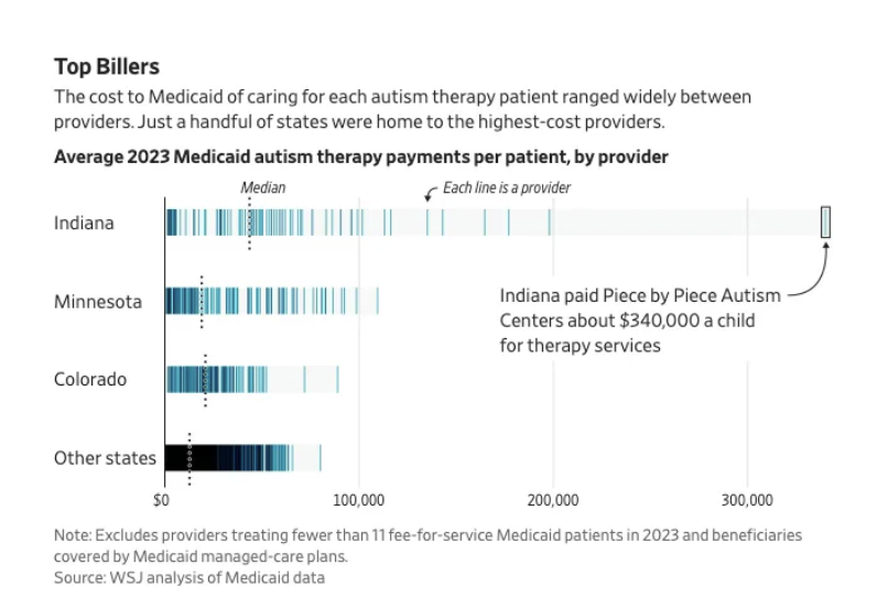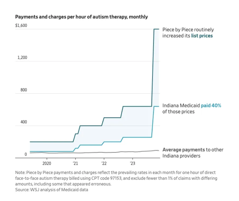 INDIANA: In Indiana, Piece by Piece Autism Centers is accused of exploiting Medicaid billing rules, receiving about $340,000 per patient at one point. From 2019 to 2023, Indiana directly paid the group roughly $58 million. The state has since barred the group’s providers from billing Medicaid.