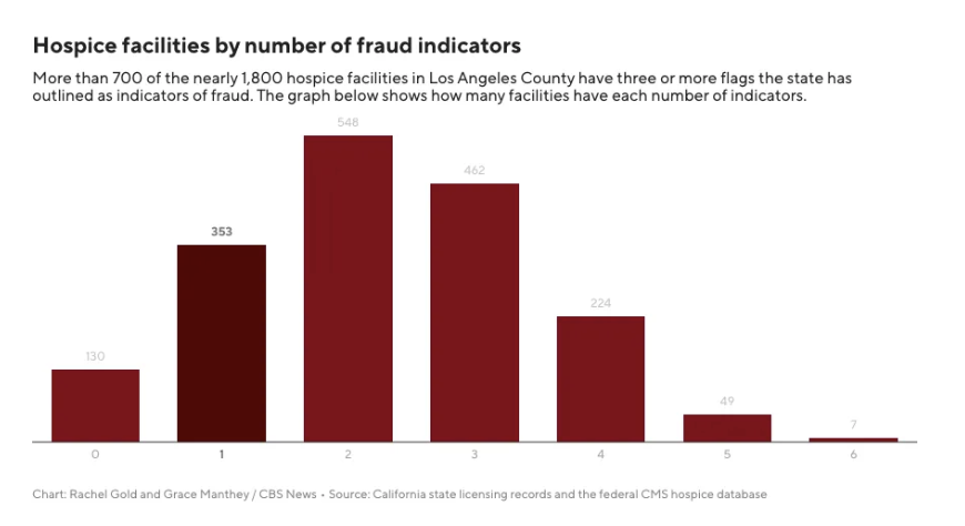 CALIFORNIA: CBS News investigations found that over 700 of the roughly 1,800 hospices in LA County triggered multiple red flags for fraud, including spotting that 89 ‘hospice' companies claim to operate out of one three-story building (see chart below). Recent reporting from Shirley on Medicare fraud tied to California’s hospice is also drawing congressional scrutiny. Rep. James Comer (R-KY) says as much as $3.5 billion may have been lost to fraud, with much of it tied to Los Angeles County.