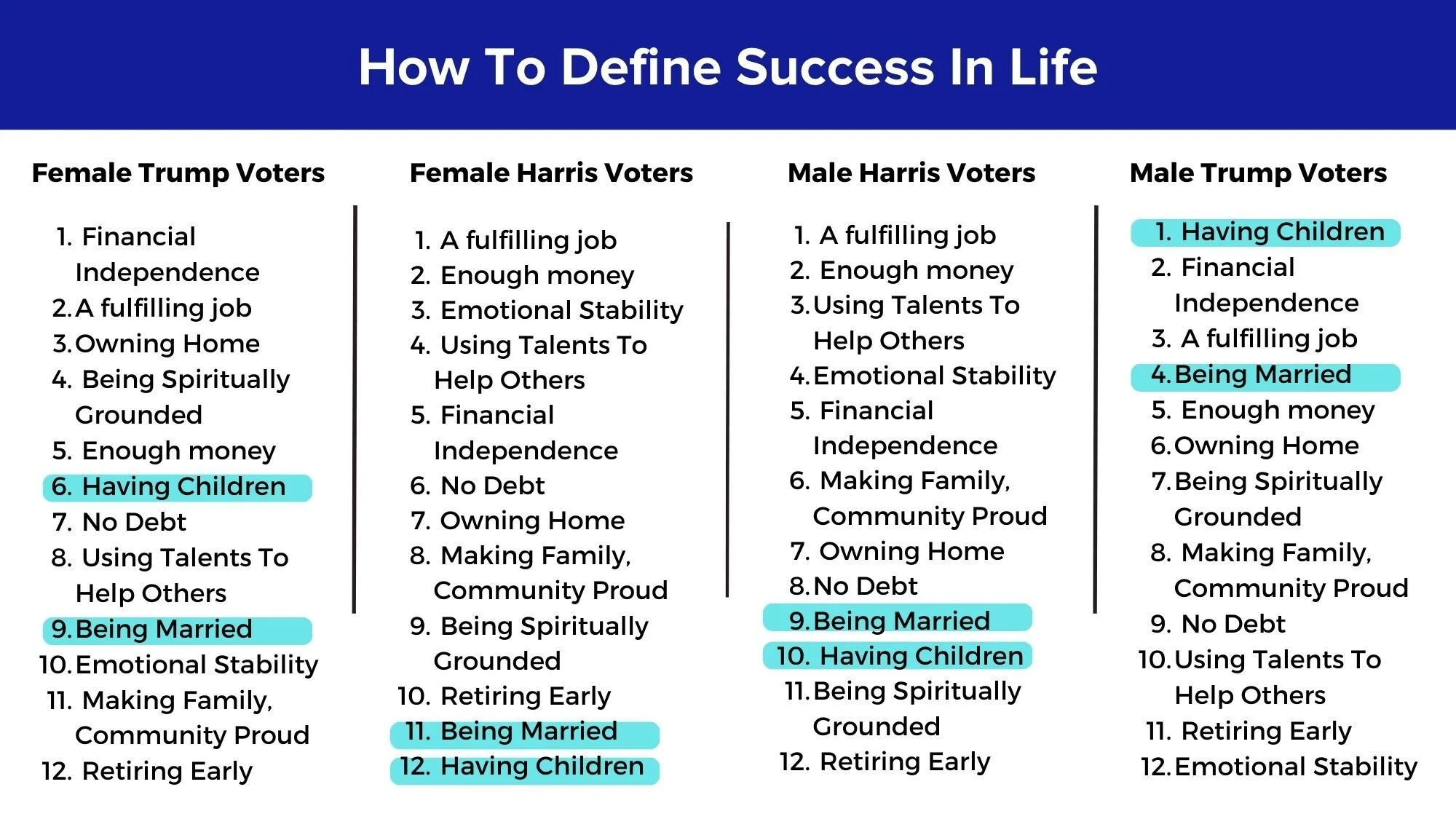 Gen Z men who supported Trump ranked having children as the top factor defining success. For young women who supported Kamala Harris, it ranked near the bottom — with “a fulfilling job or career” topping their list.