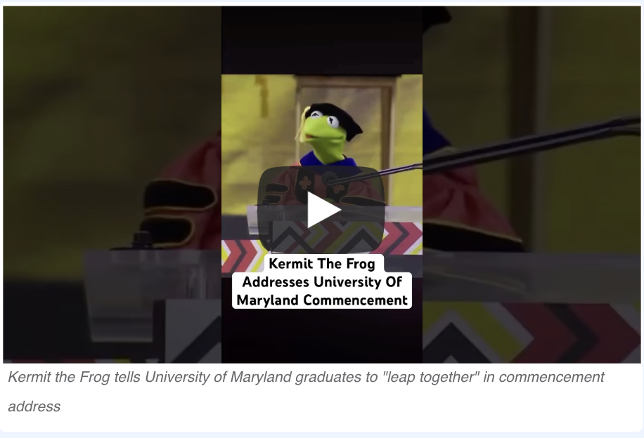 In case you missed it… Kermit the Frog from The Muppets delivered the commencement address at the University of Maryland Thursday, clad in a tiny graduation cap and gown.
