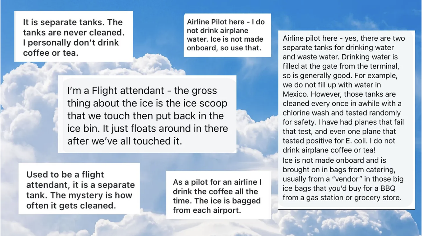 Another pilot said he does NOT drink airplane water, which is what’s used to make coffee. He says there are two separate water tanks— one for drinking water, one for the bathrooms & toilets. The drinking water is filled at the gate, so it’s generally good. But, no telling how often they clean the tanks.