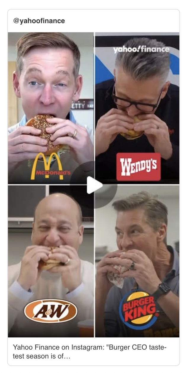 Wendy’s is joining the fight. The company posted a video to LinkedIn of its U.S. head, Pete Suerken, chowing down on a Baconator burger with fries and a Frosty on Wednesday.
