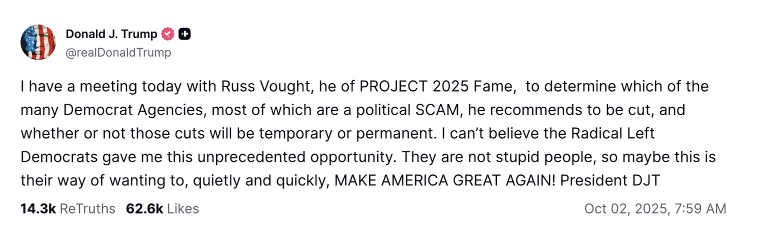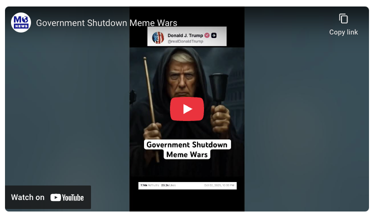 The meme strategy highlights how Trump is framing the funding battle — a cultural spectacle designed to cast Democrats as villains.