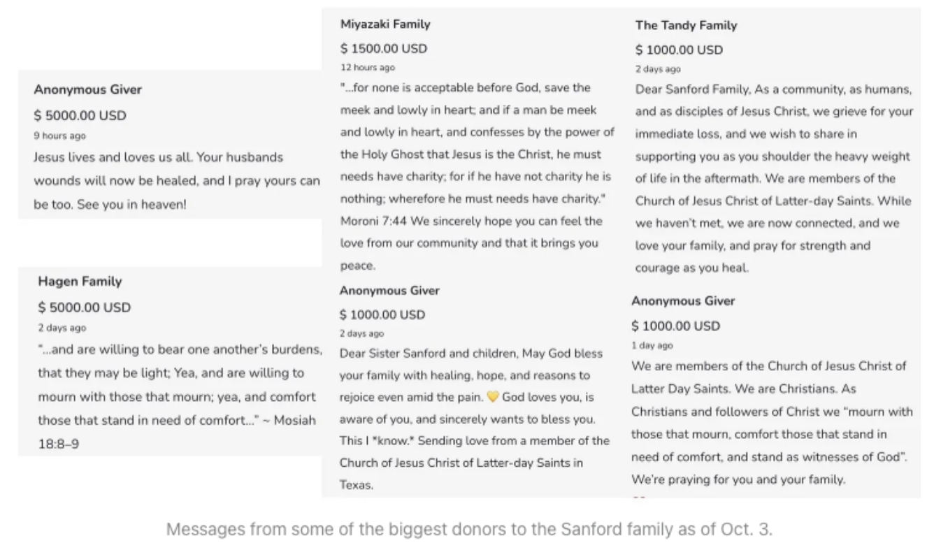 The fund for Sanford’s family was launched Tuesday by Utah-based writer and church member Dave Butler, who has no connection to Grand Blanc or the Sanfords. Butler told the New York Times he hoped the effort would reflect his faith’s teachings: to “mourn with those who mourn,” turn the other cheek, and care for widows and orphans. Donations began pouring in within minutes. Many came with Bible verses and messages of forgiveness.