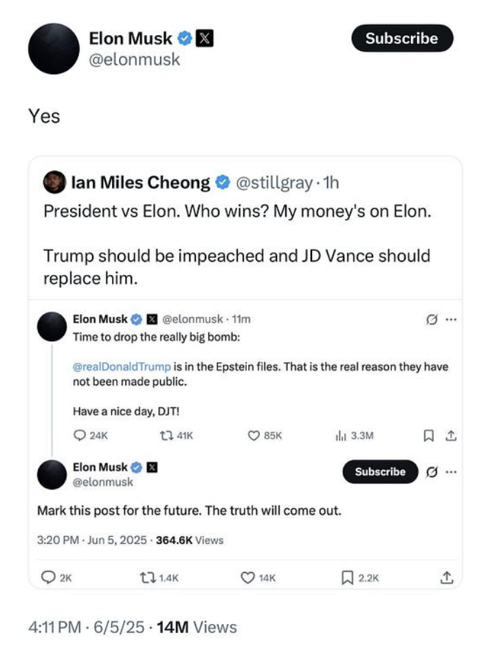 Well, that didn’t take long — the First Friendship between Elon Musk and President Donald Trump imploded Thursday, with the two lobbing insults at each other, with Musk responding “yes” to a post calling to impeach Trump.