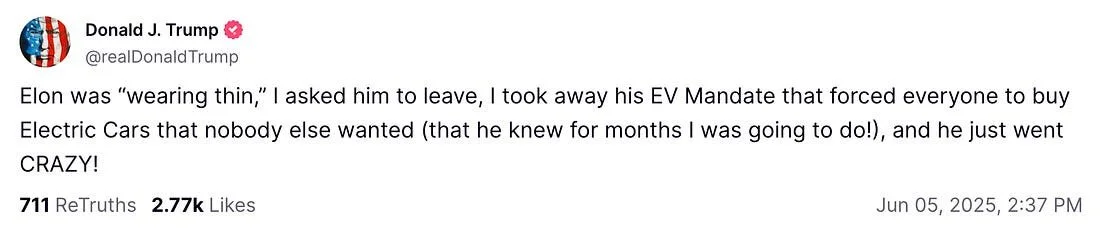 From the Oval Office Thursday, Trump said he’s “very disappointed in Elon,” accusing Musk of having “Trump derangement syndrome,” flipping his support after leaving the White House (just over a week ago), and trashing Trump’s “big, beautiful” tax cut bill.