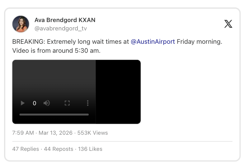 AUSTIN AND DHS RESPONDThe airport released a statement in response: “AUS is experiencing higher passenger volumes as spring break travel coincides with Austin’s spring festival season…The partial federal government shutdown remains in effect, and unanticipated delays may continue to occur.”