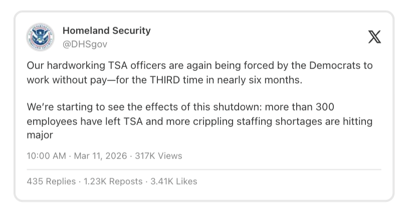 The partial government shutdown — which affects only Department of Homeland Security funding — began Feb. 14. DHS oversees the TSA, FEMA, and immigration enforcement. The shutdown stems from Democrats' disagreement with the Trump administration's immigration enforcement.