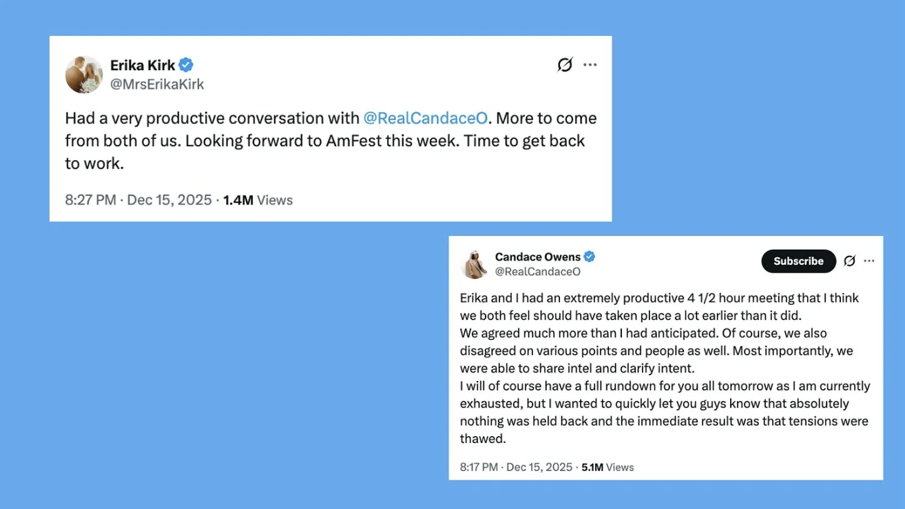 In case you missed it… Charlie Kirk’s widow Erika Kirk said that she had a productive meeting with podcast host Candace Owens Monday night. Owens echoed the message.