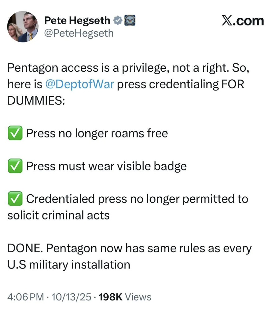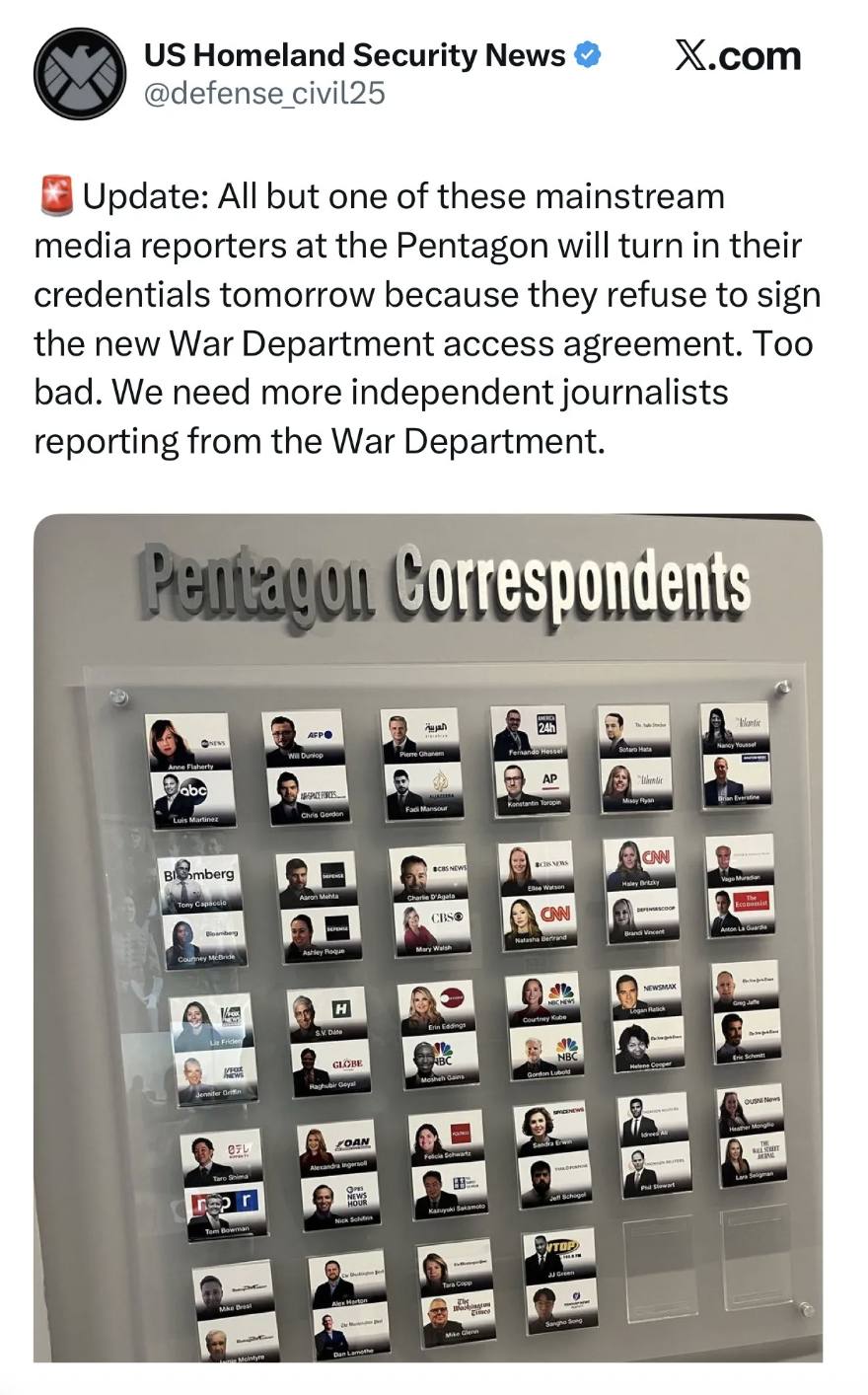 Dozens of reporters from major news outlets are handing over their Pentagon press badges today after a new restrictive media policy took effect Tuesday evening. ABC, NBC, CBS, The Washington Post, The New York Times, The Wall Street Journal, the Associated Press, Newsmax, The Washington Times, and dozens more refused to sign a pledge, introduced by Defense Secretary Pete Hegseth last month, not to obtain or use any unapproved/unauthorized material — even if the information is unclassified.