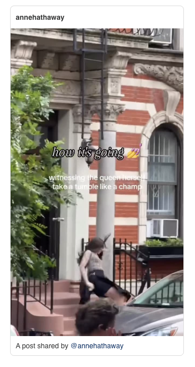 In case you missed it… Anne Hathaway went viral after tripping on set of The Devil Wears Prada sequel in NYC. She laughed at herself Thursday on Instagram, comparing it to her Princess Diaries fall: “Twenty years later, still falling for you...”