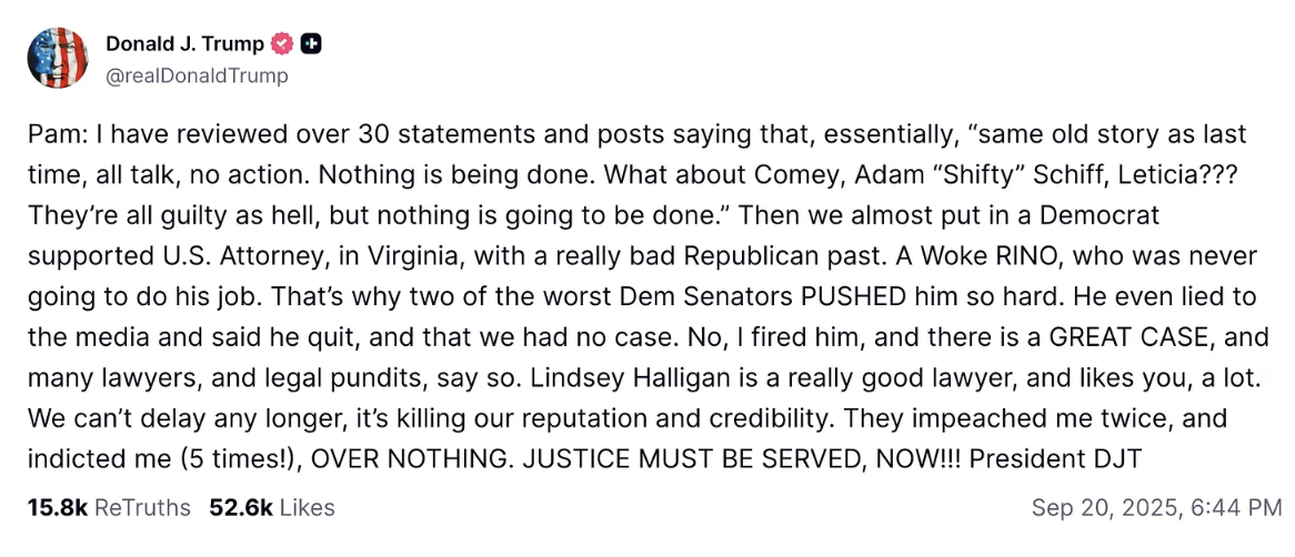 Over the weekend, Trump directed a Truth Social post to Attorney General Pam Bondi, telling her to speed up prosecutions of his political enemies, calling them “guilty as hell.”