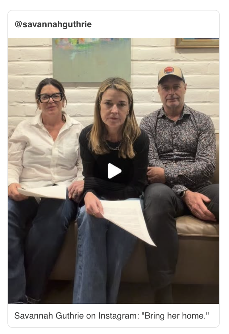 NBC Anchor Savannah Guthrie’s mother has been missing since early Sunday morning, and Pima County Sheriff Chris Nanos said he believes she is still “out there.” Nanos emphasized that no one has been ruled out as a suspect yet, either.