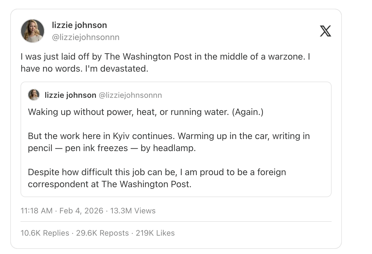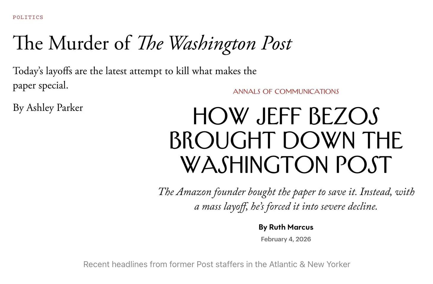 The Washington Post laid off roughly one-third of its staff (~300 reporters) this week, eliminating its sports section, most of its books coverage, and most of its foreign reporters. The shakeup has raised questions about the state of legacy media — and whether billionaire owners have any chance of saving publications in decline.