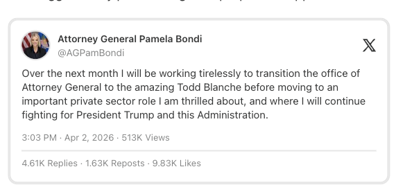 THE ANNOUNCEMENT: Trump posted on Truth Social, calling Bondi “a Great American Patriot and a loyal friend,” noting that she will be “transitioning to a much needed and important new job in the private sector.” But, Trump has reportedly been weighing Bondi’s future for months, frustrated with her handling of the Jeffrey Epstein files and for not aggressively prosecuting Trump’s political opponents.