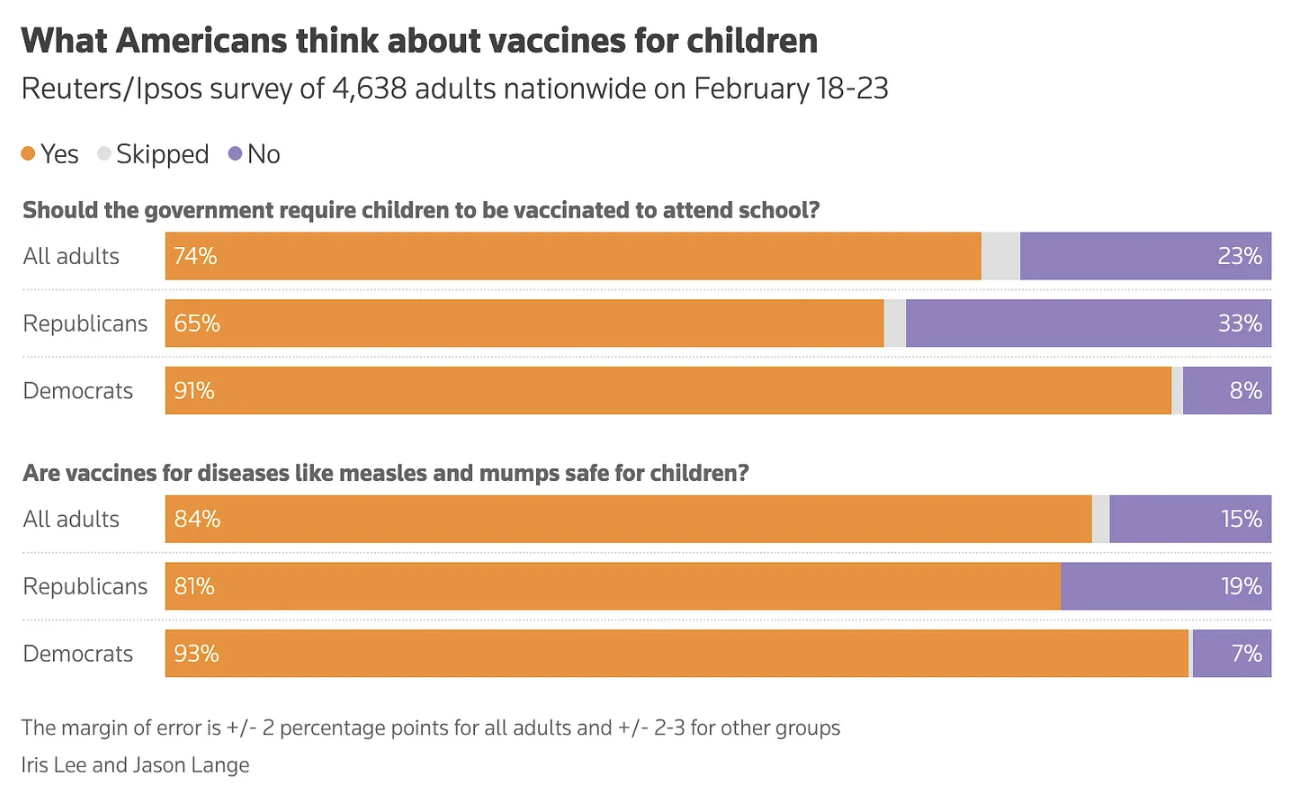 A recent Reuters/Ipsos poll of over 4,000 U.S. adults, which closed on Monday, showed that 84% of respondents believed that vaccines for diseases like measles, mumps, and rubella are safe for children.