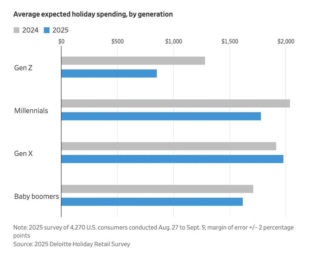 Generational Divide: Gen Z is spending less than other age groups, with the group expecting to dial back holiday spending by an average of around 34%, according to a recent Deloitte survey. It comes as 20-somethings grapple with higher costs for housing, student loans, restaurant meals, and groceries.