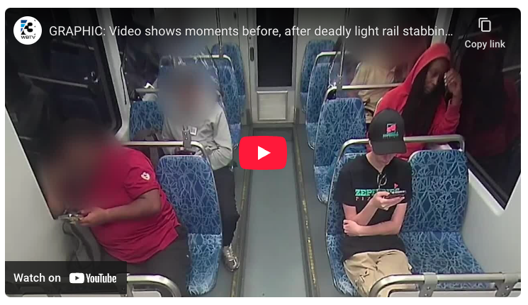 Brown pulls out a knife and stabs her in the neck without any prior interaction. He then drops the knife and calmly walks off the train, where police arrest him on the platform. Brown’s mother told CNN he struggled with his mental health in the past and had been homeless.