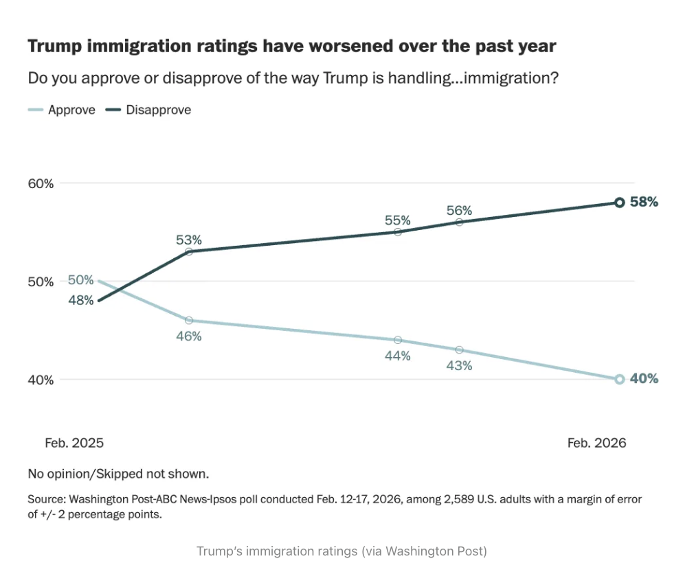 A Washington Post–ABC News–Ipsos poll from last month found 58% of Americans say the Trump administration’s deportation strategy has gone too far — eight points higher than last fall.
