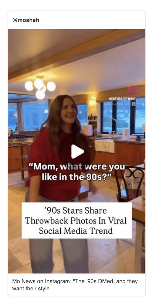 Celebrities like Drew Barrymore, Mario Lopez, and Reese Witherspoon are posting photos of themselves from the 1990s, set to “Iris” by the Goo Goo Dolls. Fashion choices from the decade included baggy jeans, flannel shirts, and grungy haircuts. 🤘