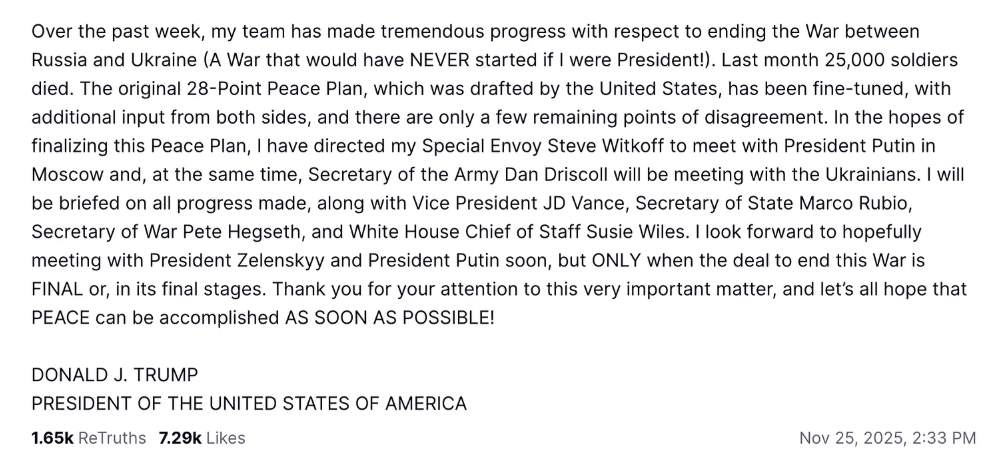 Trump wrote on Truth Social: “The original 28-Point Peace Plan, which was drafted by the United States, has been fine-tuned, with additional input from both sides, and there are only a few remaining points of disagreement.”
