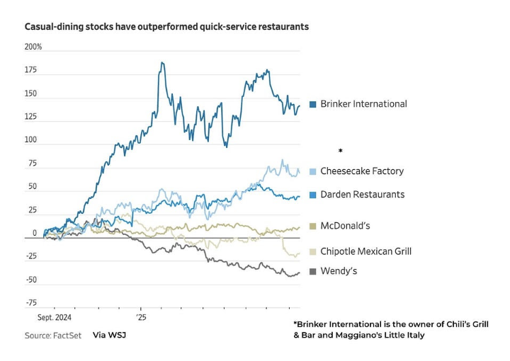 There’s a clear winner in the latest restaurant wars: Casual Dining. Think: Chili’s and Olive Garden vs. McDonald’s and Sweetgreen. And it’s the opposite of what many analysts expected, as Americans have started to pull back on spending.