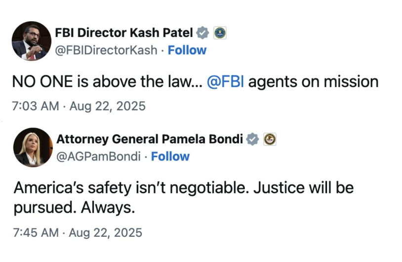 Patel and Attorney General Pam Bondi posted on X Friday, appearing to reference the raid.