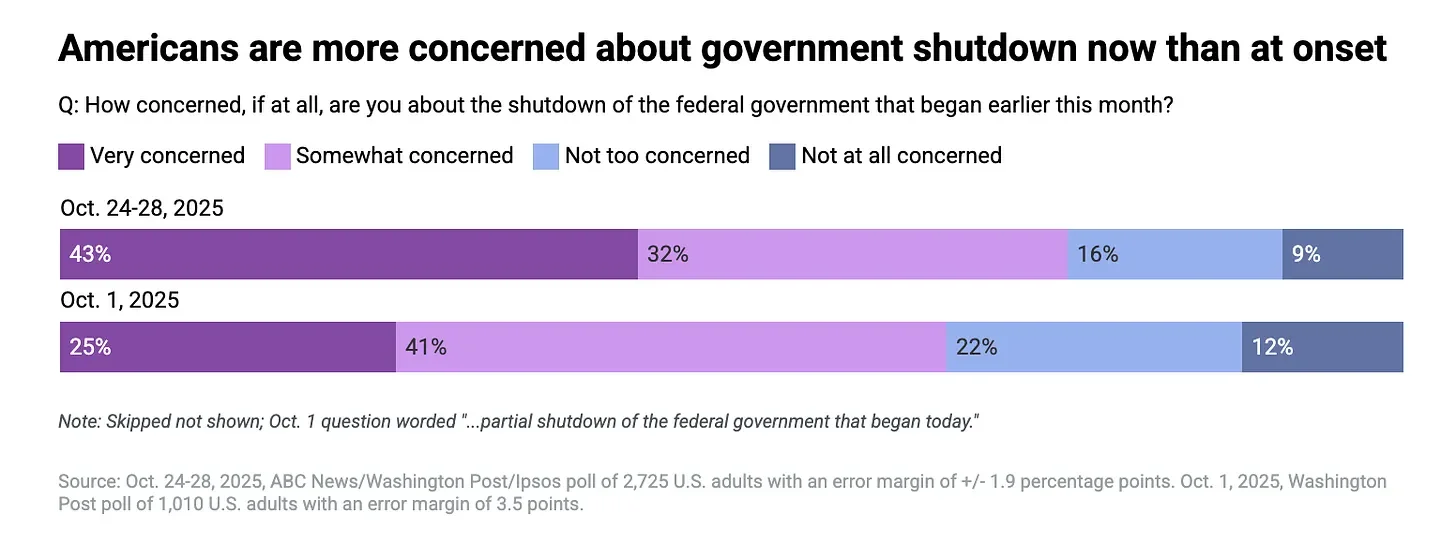A new ABC/Washington Post poll finds Democrats still hold the upper hand politically: 45% of Americans blame Trump and congressional Republicans for the shutdown, compared to 33% who blame Democrats. Among independents, the margin is even wider — 2-to-1 blaming the GOP.