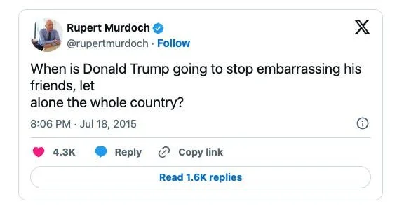 Murdoch’s outlets — including Fox News and The New York Post — have been credited with helping Trump win the presidency. Trump frequently watches Fox and reads The Post, often sharing their stories on Truth Social, and back in February, Trump praised Murdoch in the Oval Office, saying he is “in a class by himself” and “an amazing guy.” Trump added, “I don’t agree with him on some things.”