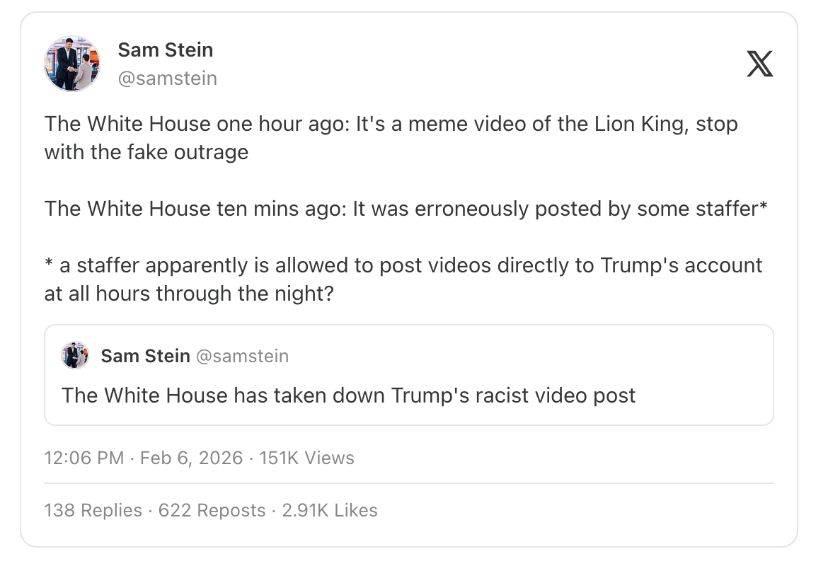 The White House initially called criticism of the post “fake outrage” and criticized the media for asking about it, but later on Friday pivoted to blaming a staffer for posting the video. (The Trump press office reflexively defends the president, regardless of the controversy).